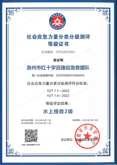 经省应急管理厅评定并报请应急管理部复核:厦门市曙光救援队获评建筑物倒塌搜救、水上搜救1级队伍,为福建省首支“双一级”社会应急救援力量;泉州市红十字迅捷应急救援队获评水上搜救2级队伍,为福建省首支二级社会应急力量。