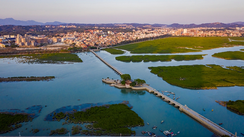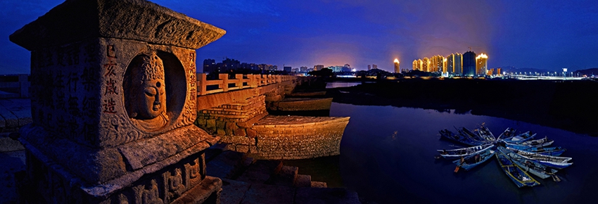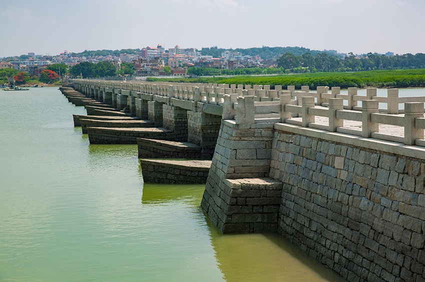 Luoyang Bridge is a representative component reflecting the Transportation Network of Quanzhou as an emporium of world maritime trade. Luoyang Bridge is situated at the mouth of the Luoyang River about 10 kilometers northeast of Quanzhou city. It was originally known as Wan'an Bridge as it was near the ancient Wan'an Ferry. It was a vital transportation link connecting Quanzhou to northern Fujian and the interior regions. Construction began on Luoyang Bridge in 1053 and was completed in 1059. Running northeast to southwest, the extant bridge is about 731 meters long and 4.5 meters wide. It has 47 spans and 45 piers and passes a small natural island in the middle of the river. The stone beams of the bridge are granite strips of a considerable size. There are balusters and guardrails on both sides of the bridge deck. During the construction, rocks were laid on the bottom of the river to form a dyke, on which piers with pointed cutwaters were set; this is akin to the construction of "raft-shaped foundations" in modern engineering. To prevent the rocks from being swept out by the strong currents, oysters were bred on the piers, a method known as "reinforcing the foundation by cultivating oysters". It was an ingenious method of using living organisms to assist in reinforcing the structure of a bridge. Heavy stone slabs were carried by wooden boats into position at high tide, and the boats moved away at low tide, putting the slabs into place; this was known as the method of "transporting heavy stone slabs by using buoyancy forces and waves". These technical methods demonstrated the ingenuity and creativity of the people in adapting the construction process to local conditions.