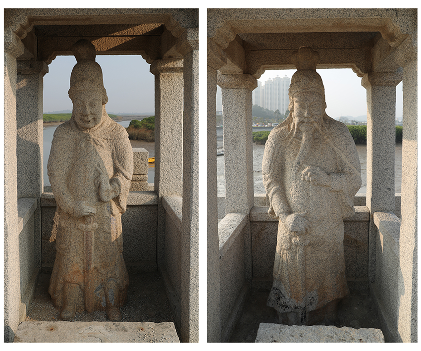 There are some ancillary structures on the bridge, the small island in the river, and the northern and southern ends of the bridge. On both sides of the bridge, there are seven stone towers in various shapes from the Song Dynasty, as well as four stone statues of generals providing divine protection for the bridge. On the islet stand the Central Pavilion and the Stele Pavilion with the inscription "Western River, Sweet Rain". On the southern end of the bridge is a temple dedicated to Cai Xiang, who is credited with building the bridge. The temple was first built during the first half of the 12th century, and the extant building complex was a reconstruction in 1875. On the northern end of the bridge is Zhaohui Temple from the Song Dynasty, which is dedicated to King Tongyuan; the temple used to be the command center for Cai Xiang when he was directing the bridge construction.