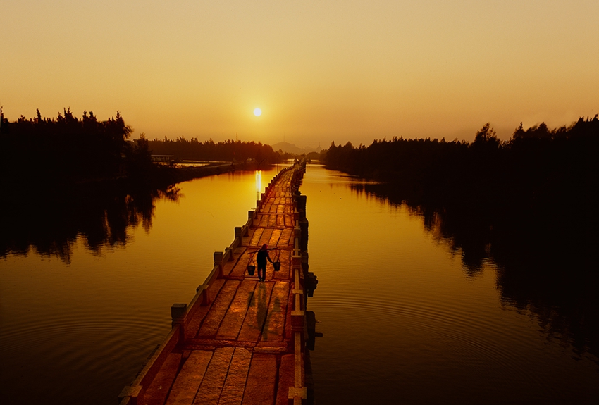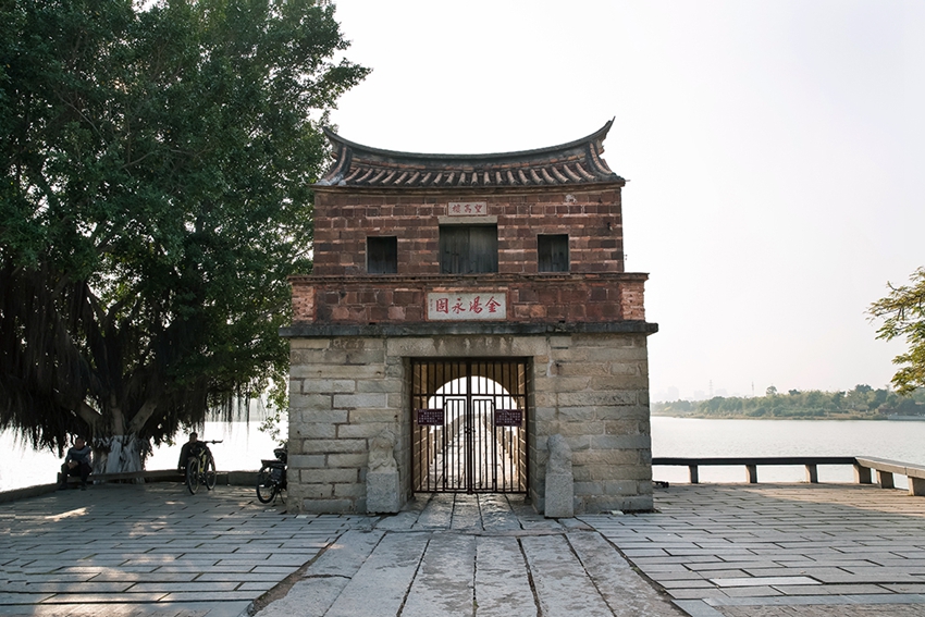 Anping Bridge is a representative component reflecting the Transportation Network of Quanzhou as an emporium of world maritime trade. Anping Bridge is located 30 kilometers southwest of Quanzhou city in a bay at the juncture between Anhai in Jinjiang and Shuitou in Nan'an. The bridge was the main link between Quanzhou and Zhangzhou and Guangzhou to the south. It is also known as Five Li Bridge due to its length, which is around five li (one li measures around 500 meters) and is China's longest existing cross-sea stone beam bridge. Construction on the bridge began in 1128 and was completed in 1152; it was a collaborative effort between monks, merchants, government officials and locals. The bridge runs roughly 2,255 meters from east to west and is between 2.9 and 4 meters wide. It is laid with long stone beams and granite guardrails run along each side. All together there are 360 stone step piers in rectangular, pointed boat-shaped and bicuspid boat-shaped styles. Lying across the piers are the huge stone beams, 5-11 meters long, that make up the bridge's deck.
