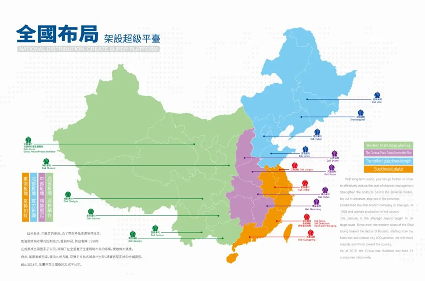 Dali Foods Group has strategically expanded its operations, establishing a gold-standard marketing network recognized across the industry. The company operates 21 subsidiaries across 18 provinces, managing a total of 36 food and beverage production bases, a potato full-flour processing facility, and a packaging and printing company.