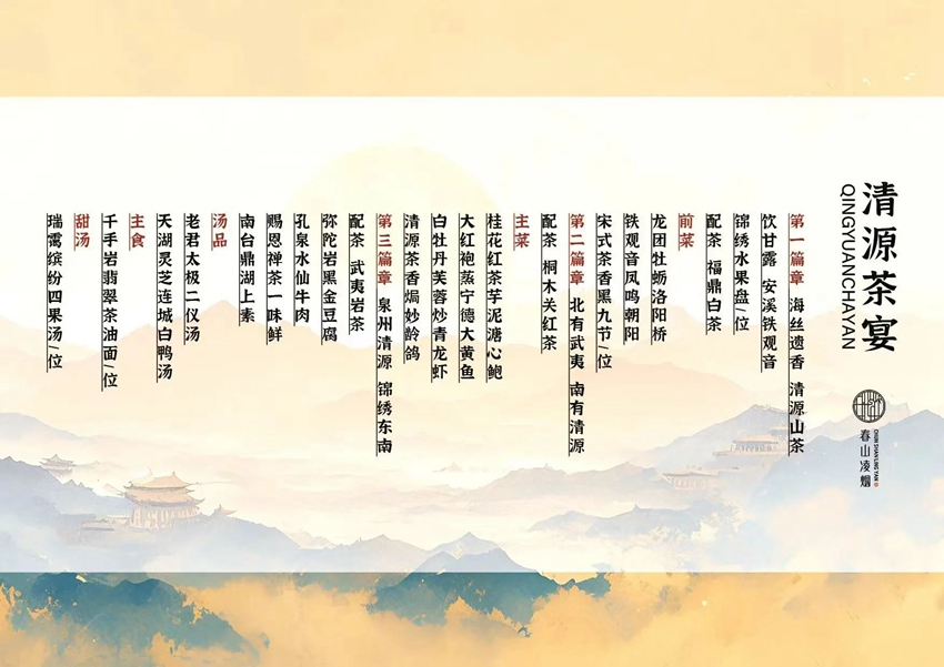 Quanzhou, a city rich in history and vitality, intertwines its ancient legends with every inch of its land, where historical charm blends seamlessly with the fragrance of tea. As cultural tourism flourishes on Qingyuan Mountain, the "Qingyuan Tea Banquet" emerges as a unique dining experience. Featuring innovative tea-inspired culinary creations, the banquet invites guests on a timeless gastronomic journey. It beautifully integrates tradition with modernity, showcasing the dedicated craftsmanship of the "Spring Mountain Tea Feast" development team and their homage to the city's World Heritage culture.