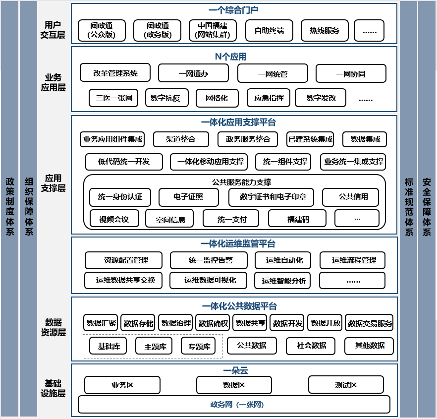 4大体系——基础设施体系、数据资源体系、支撑体系、应用体系。整合优化全省网络及云资源,构建集网络管理、云资源管理、运维保障、运行监管、运营服务为一体的基础设施体系。统筹规划全省公共数据全生命周期管理和开发应用,构建涵盖数据汇聚更新、治理管理、共享应用、开放开发、流通服务、数据资源管理及数据标准的一体化公共数据资源体系。提升全省政务服务应用支撑能力,搭建包含应用平台、技术开发、资源管理、组件管理、接口标准的一体化支撑体系。打造集业务事项应用、业务事项协同、任务管理、服务应用及移动应用五种类型的一体化应用体系,满足政务服务、政务业务与政府运行三大应用场景中各类用户群体丰富多样的业务需求。